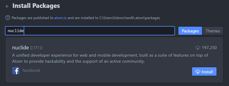 As i mentioned earlier, atom provides a command line tool called apm (short for atom package manager) that allows you to do all things you can do graphically, in the command line.. You can search for package names like this: To install hydrogen run apm install hydrogen or search for hydrogen in the install pane of the atom settings... Installing packages in atom using apm command.